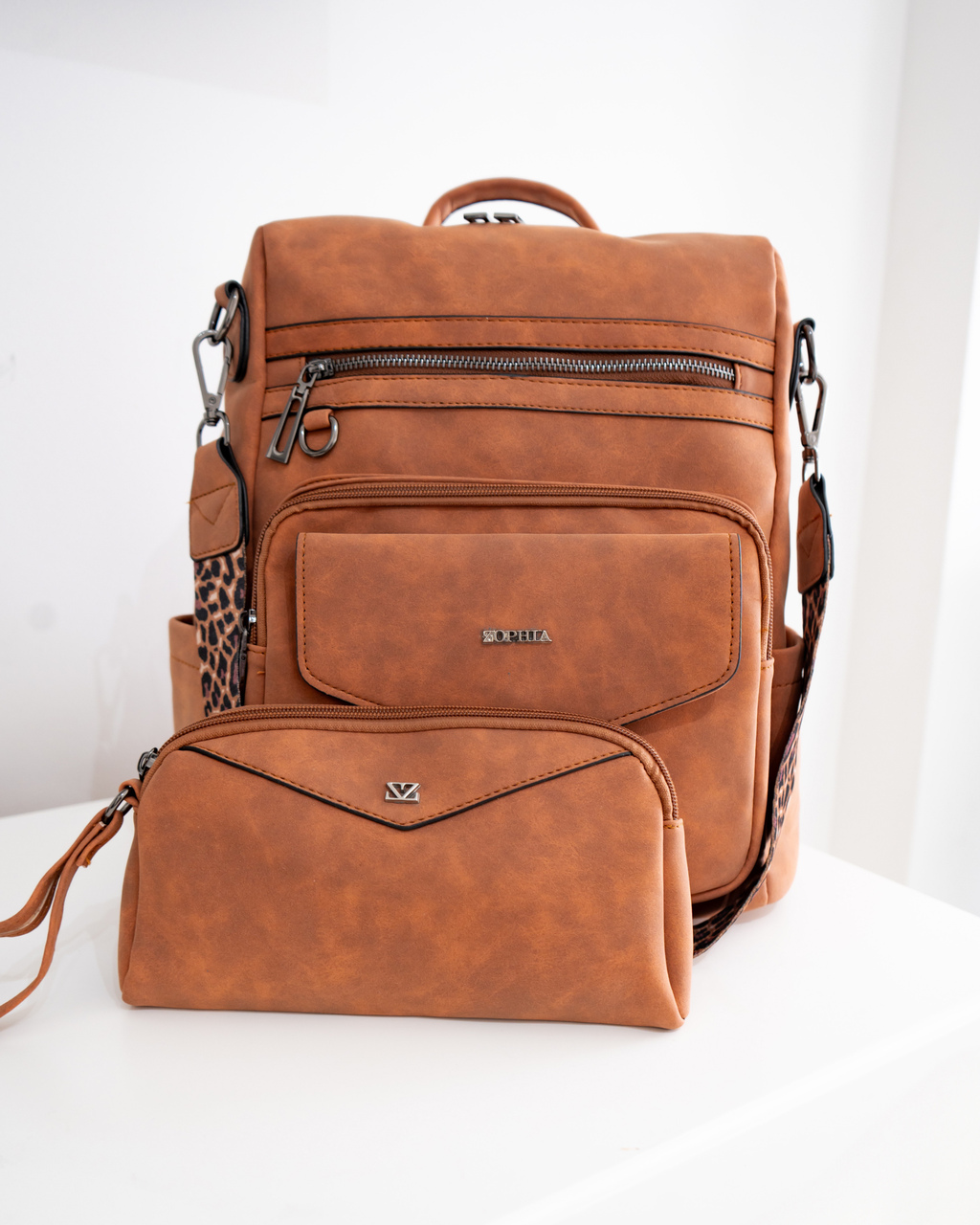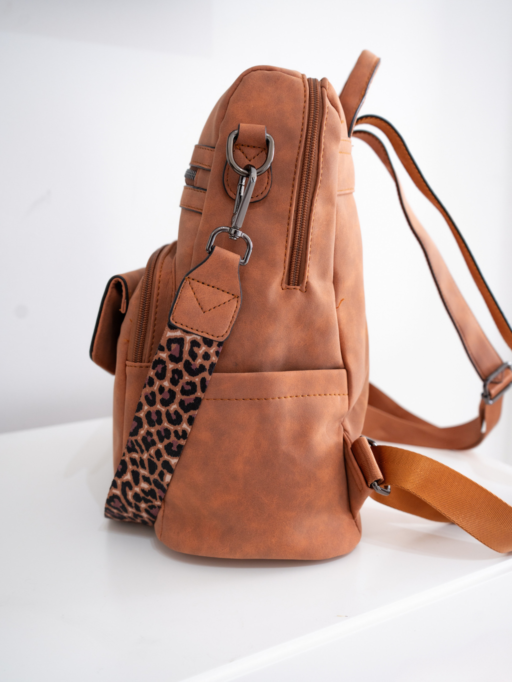 Fabricada en simil cuero, esta mochila se destaca por su hermoso diseño.